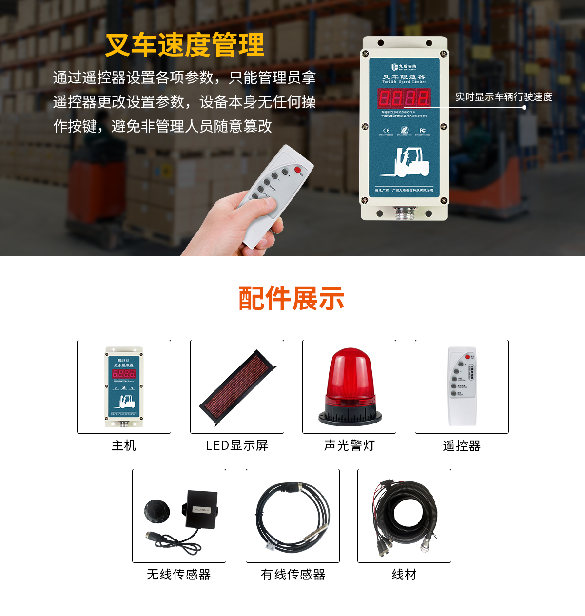 主機、LED顯示屏、線材、報警喇叭、閃光警燈、遙控器、無線傳感器(選配)