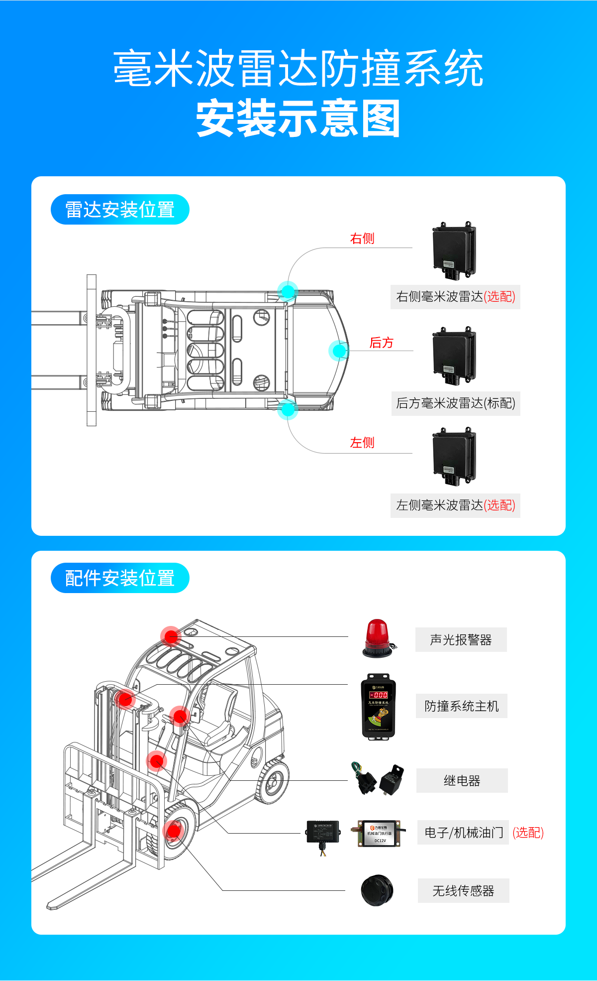 防(fang)撞(zhuang)系統、遙控器(qi)(qi)、毫(hao)米波雷達、聲光警燈(deng)、繼電(dian)器(qi)(qi)、無線傳感器(qi)(qi)、線材、電(dian)子油(you)門執(zhi)行器(qi)(qi)(選配)、機械油(you)門執(zhi)行器(qi)(qi)(選配)