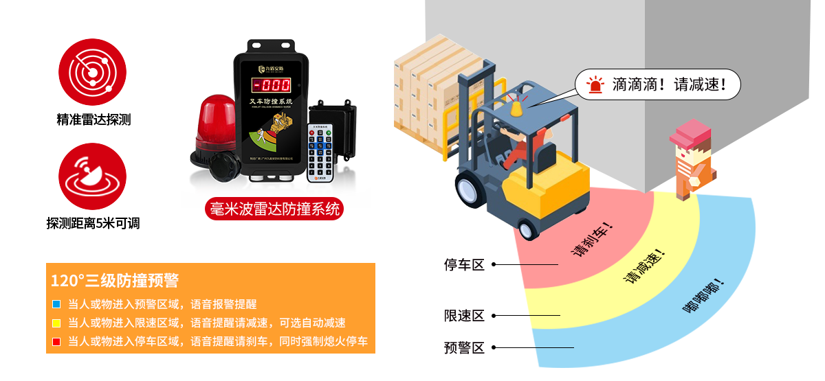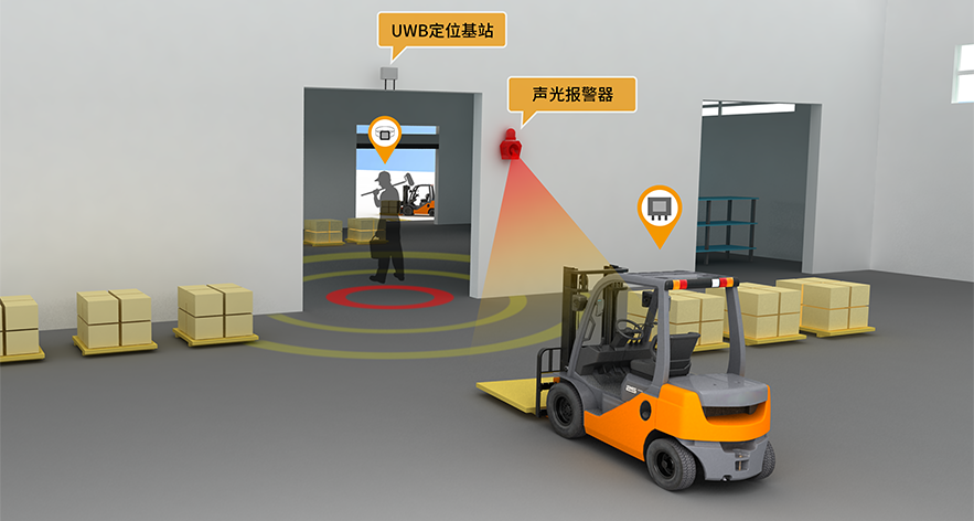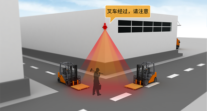 通過微(wei)波聲光(guang)報(bao)警器感應物體移動,或者UWB定位(wei)測距,有叉車(che)經過聲光(guang)報(bao)警提醒注(zhu)意安全!
