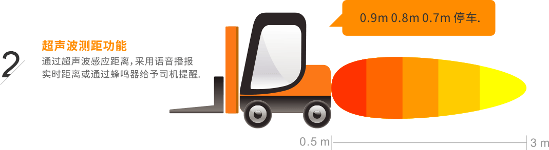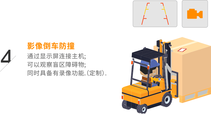 安(an)裝條形燈和箭頭燈在叉車三面形成(cheng)保(bao)護區域,司(si)機(ji)行人(ren)通(tong)過光線判斷安(an)全(quan)距離(li)防撞碰撞!