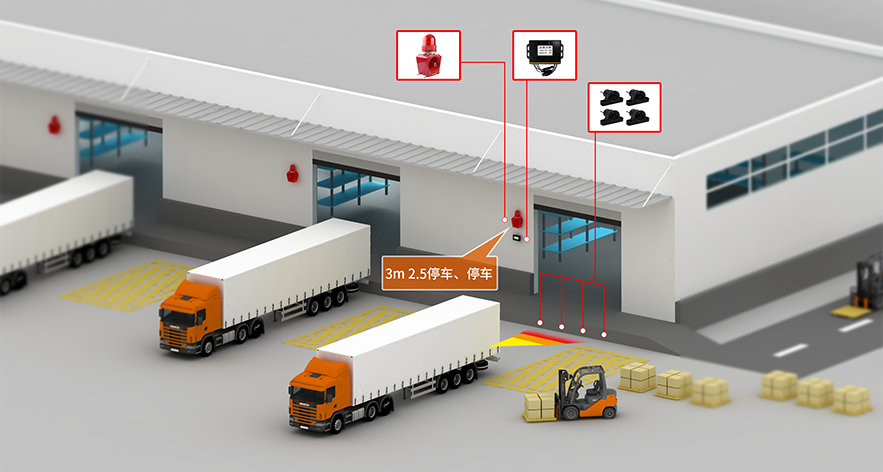 卸(xie)貨平臺安裝(zhuang)超聲(sheng)波(bo)雷達和聲(sheng)光報警器,車輛靠近卸(xie)貨平臺判斷(duan)距(ju)(ju)離報警提醒司機注意距(ju)(ju)離防撞(zhuang)!